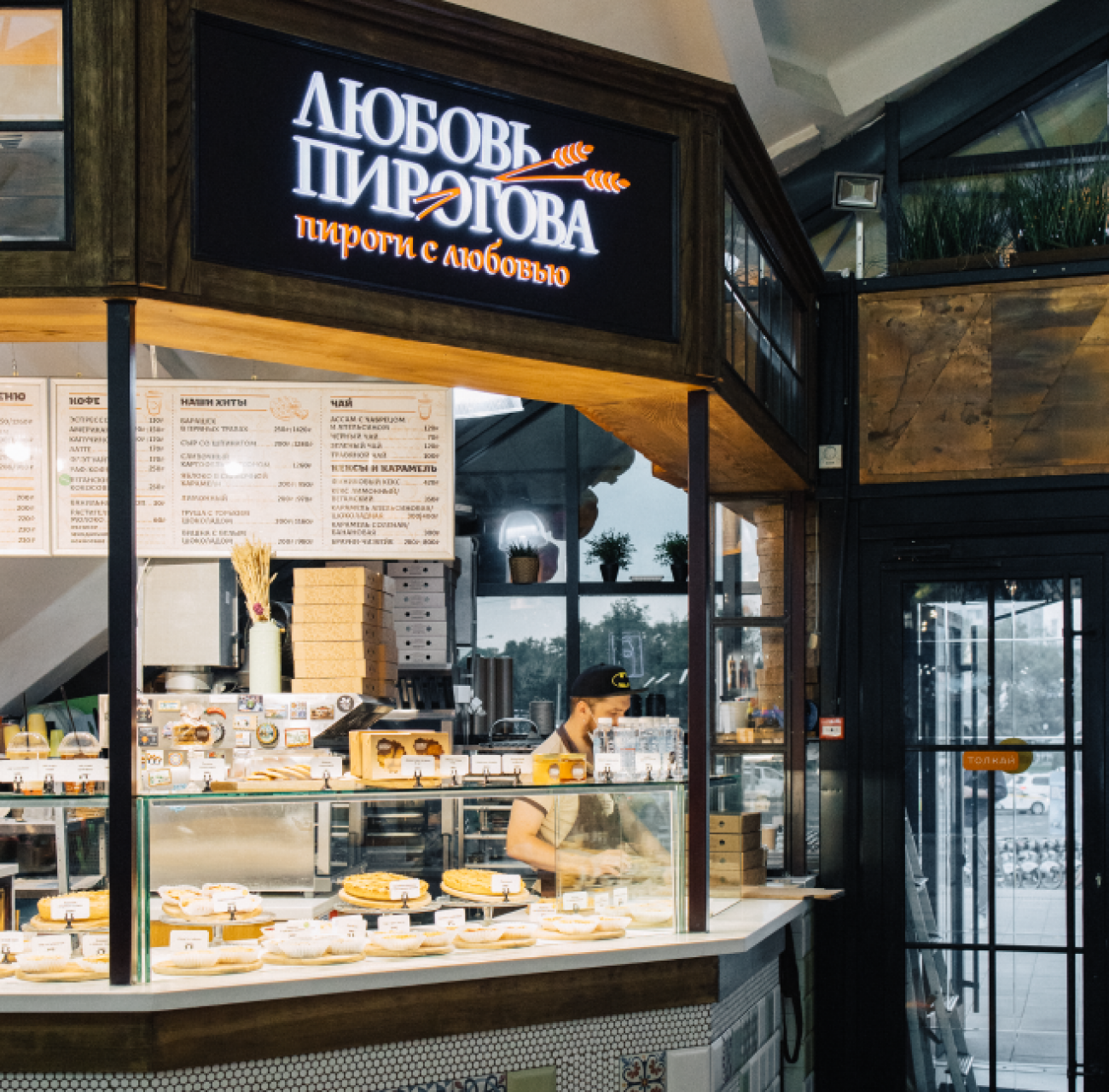 В нашем кафе на Даниловском рынке вы можете купить пироги, лимонады, печенья и карамель «Любовь Пирогова», выпить чай или кофе. Пироги всегда свежие — мы выпекаем их тут же на месте около пяти раз день.