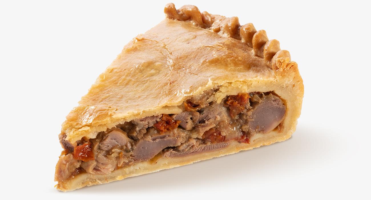 Начинка: желудки куриные охлажденные, лук репчатый, томаты вяленые, тимьян свежий, чеснок, перец черный молотый, соль, масло подсолнечное. Песочное тесто: мука пшеничная в/с, масло сливочное 82,5%, вода, соль.